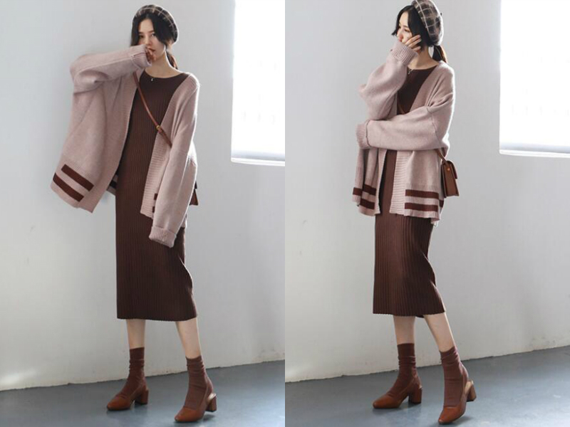 以一件宽松型的针织开衫作为外衬,显得休闲而有个性,内搭一条紧身的连衣裙,瞬间把妹子的好身材勾勒出来,裙子长至小腿,露出小半截细细的小腿,加上脚上穿的是同色系的鞋子袜子,视觉上更使双腿显得修长。