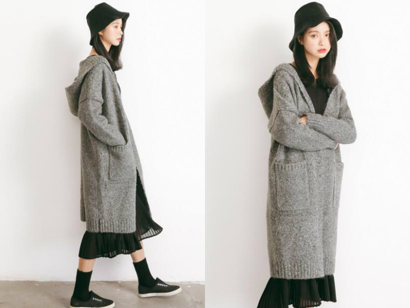 这件连帽设计的灰色针织开衫看起来休闲又时髦,内搭一件黑色的雪纺连衣裙,裙摆比开衫要长那么一点点,这样一丝层次感不经意就起到显高的作用,而且黑色与灰色结合百搭经典,让人看了觉得舒服自然。