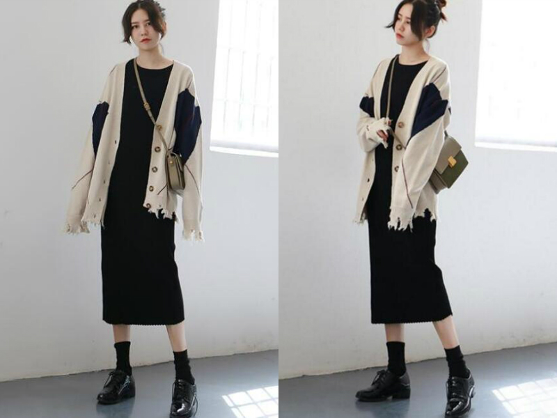 以一条黑色的修身连衣裙作为打底,裙长至小腿,搭配同为黑色的小皮鞋和长袜,看起来显瘦之余也显高,搭配的开衫为不规则版型,杏色与黑色的撞色设计与连衣裙很好的融合在一起,再绑一个丸子头发型,露出纤细的脖子线条,身形则显得更加修长了。