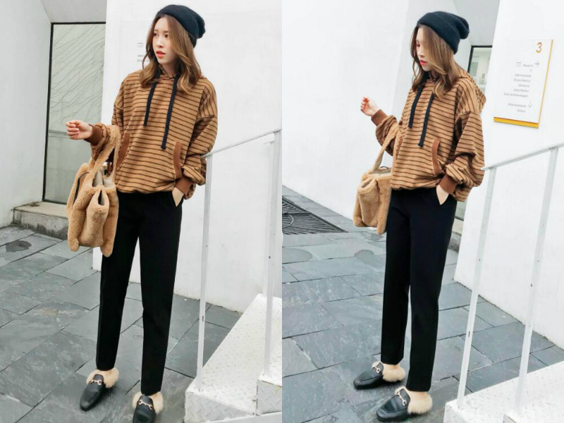细条纹设计的卫衣本就有显瘦效果,加上宽松的版型,更是很好的起到遮肉的效果,手上背一个与卫衣同色系的包包,色泽搭配就有了。下身则穿一条黑色的直筒裤,直筒裤的好处是不管妹子是什么腿型都能修饰的又长又直,想显高当首选哟!