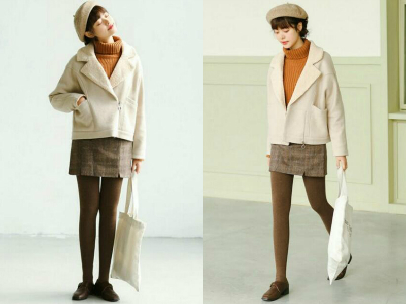 矮个子的mm不用担心hold不起长款呢子外套,我们还可以选择短款的哦!像妹子这样内穿一件橘色高领毛衣,外搭一件短款的翻领呢子外套,保暖又修身,下边配一条棕色格纹半身裙加一套同色系的打底裤,轻松穿出层次感,双腿也显得又长又细!