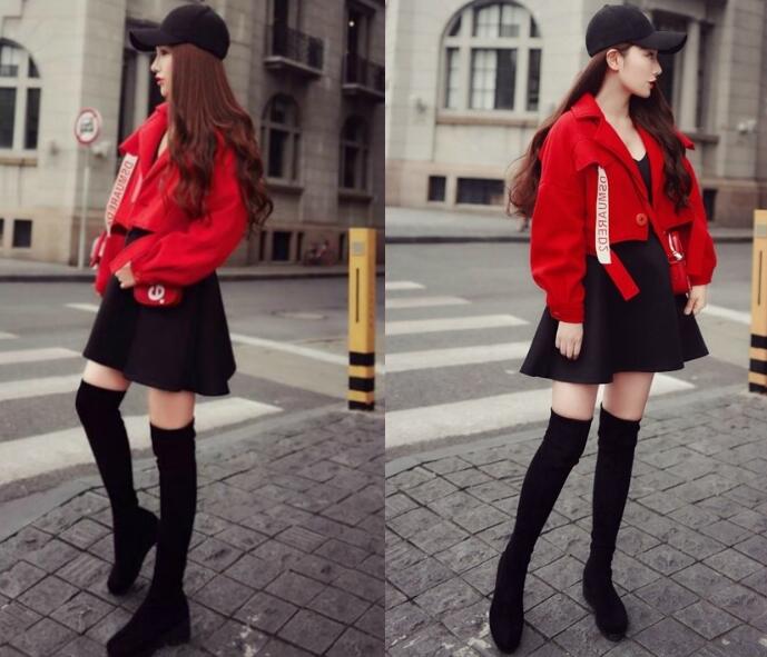 再说一次,上衣的长度很重要,短短的一件外套真的非常拉高腰线,醒目的红色视觉上把腰线拉得更高,内搭黑色的短裙,再穿上长长的靴子,视觉上更显大长腿,这样的穿搭也是非常的潮流时尚哦。