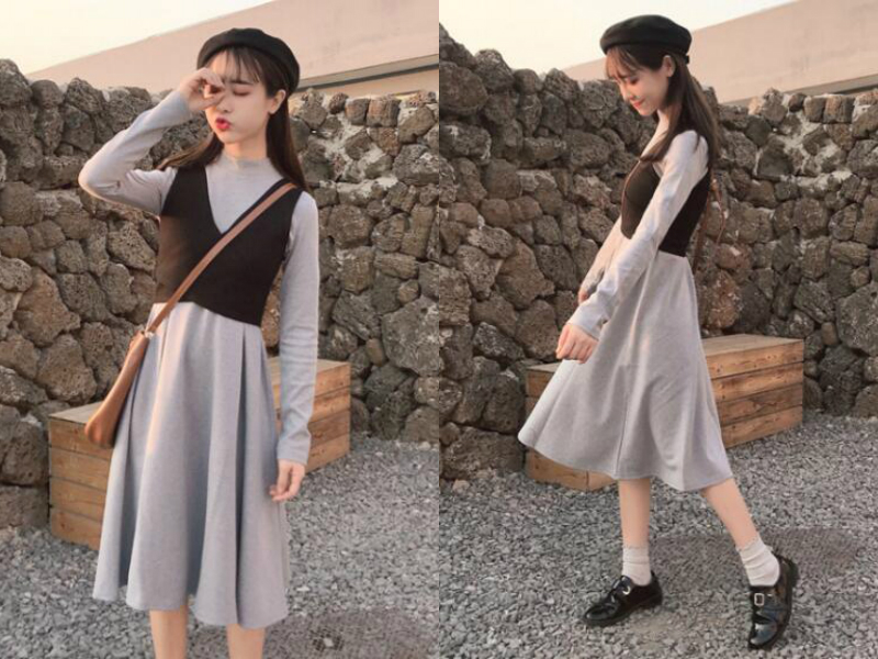 一件黑色的短小马甲套在灰色连衣裙上,视觉上轻轻松松就能提升腰线,也很显纤细的腰,整体没有过多繁复的搭配,非常省心,简约时尚大方,所以只要把握好提高腰线的法则,过膝的连衣裙也能让小个子女生看起来很修长。