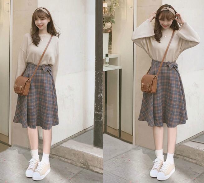 把上衣扎进裙子里的确很能拉高腰线,真是百试百灵,不但修身显瘦,还完美的分割出大长腿的黄金比例,下身穿上一条长度刚刚好的及膝裙子,让下半身显得更加修长,毛衣搭配及膝裙子的显高穿搭真的很适合小个子女生。
