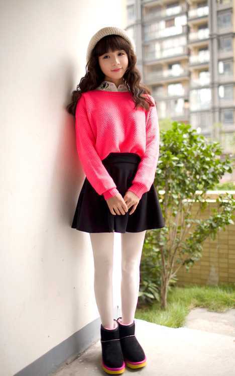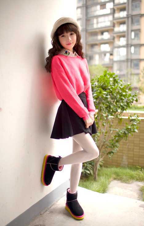 前短后长的独特蝙蝠袖糖果色毛衣,搭配上荷叶边高腰短裙,毛衣束起来既能显瘦又能很好的遮住肚子的小肉肉,搭配纯白色的打底裤很清新迷人,宽松鞋口的雪地靴穿起来有修饰纤细腿形曲线。