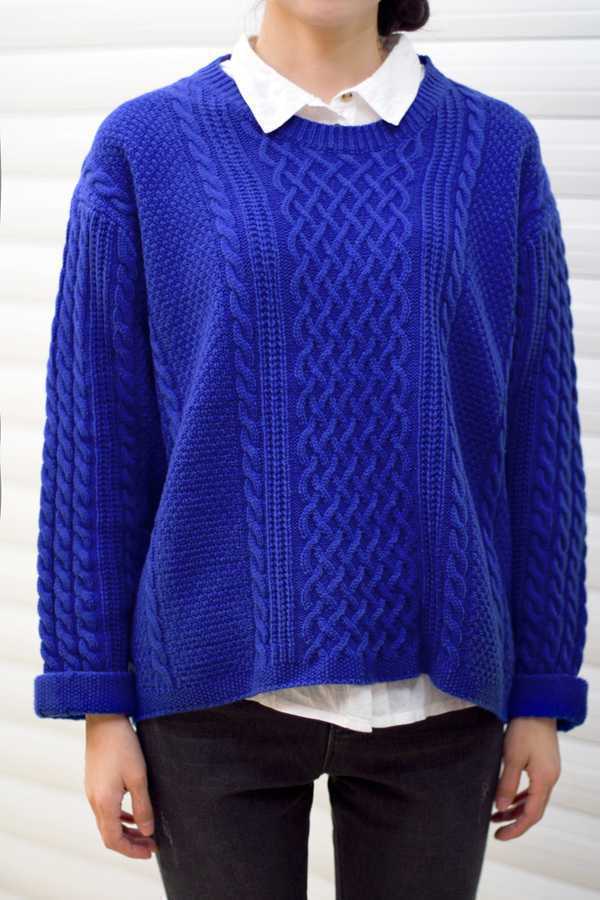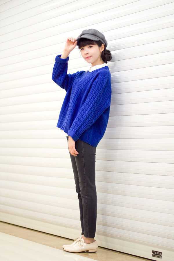 亮蓝色的宽松版毛衣,穿起来很显白皙肤色,厚实粗纹毛衣,随意搭配都能搭出小清新甜美气质焕发。