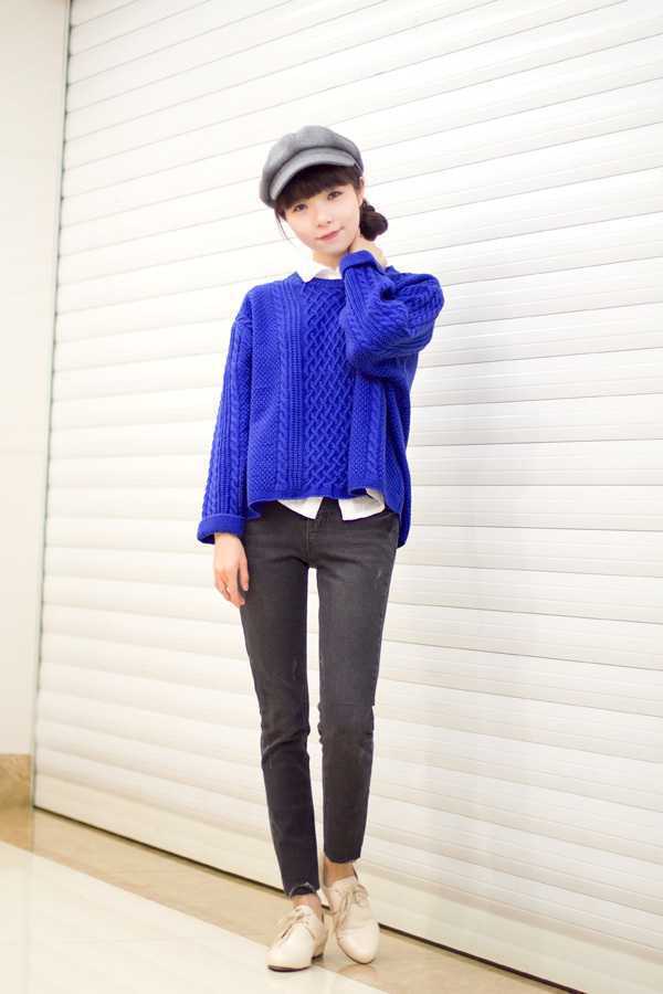 粗纹糖果色亮蓝色短款毛衣,前短后长的版型,微微露出内衬的白色衬衫,超时尚潮流穿衣方式,宽松版毛衣的腰身和袖子,完美遮掩腰身和手部的拜拜肉,搭配百搭黑色紧身小窄裤,在冬日时刻都能保持青春靓丽潮装扮出行。
