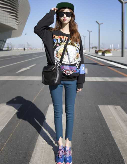 经典的圆领设计,张扬夸张的猫头鹰图案印花,洋溢出绚丽靓丽气息,款式的版型很有显瘦效果,搭配紧身的蓝色小窄裤,穿起来更显得纤细腿形曲线,随意穿上一对运动鞋就轻易变得动感活力十足。