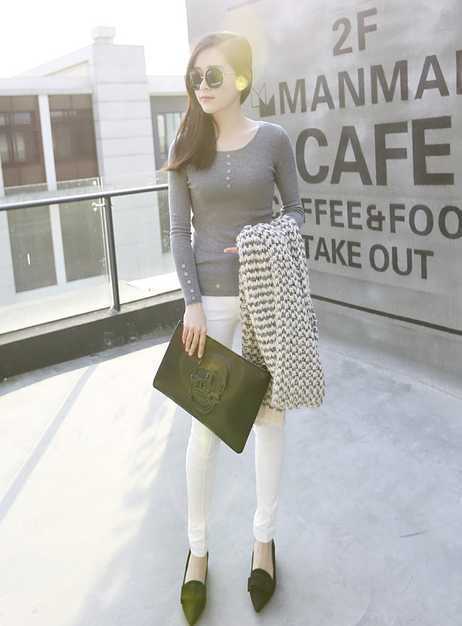 很修身时尚的春季白色铅笔裤,搭配低调显瘦打底衫,显瘦又不失时尚感,穿出春季显肤色时尚感装扮,是胖MM必备的显瘦利器。