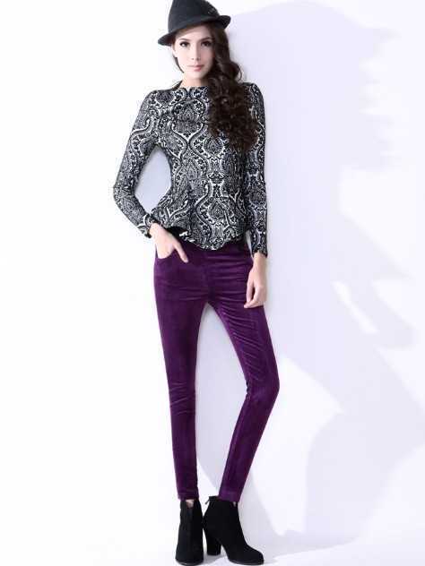 霸气时尚春季黑色一字领上衣,紧身收腰的款式,完美秀出纤细腰身曲线美,搭配紫色小脚裤和黑色高跟鞋,很显高优雅。