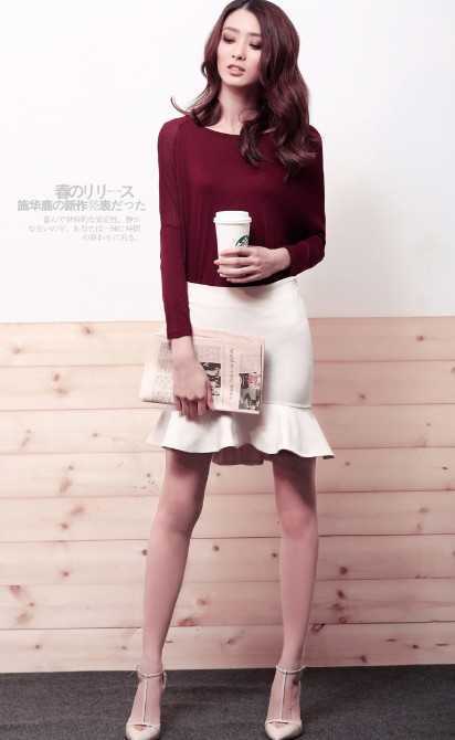 春季高腰鱼尾短裙,修饰出纤细腰身曲线,束起复古风套头衫,显高又显瘦,加上白色高跟鞋,完美再现出迷人女人气质,是胖MM显瘦最佳搭配法。