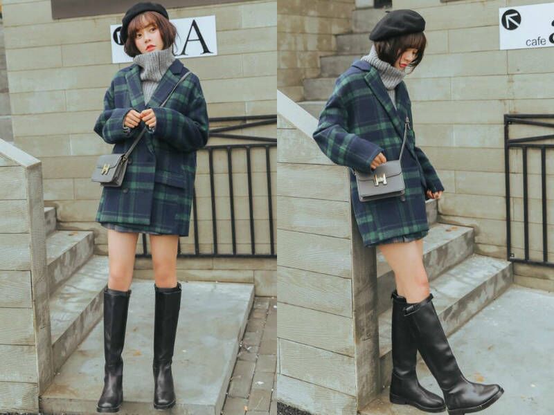 这是一款比较学院风的冬天遮肉显瘦穿搭示范,墨绿色的格子呢大衣充满学院气息,内搭一件高领毛衣,妥妥的防寒保暖,外套长度只到大腿中部,再穿上一双高筒长靴,露出大半部分玉腿,更显腿型修长了。