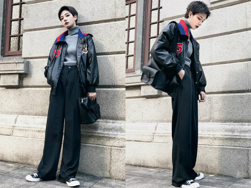 以一件灰色高领毛衣作为内搭,修身又保暖,外面穿一件黑色棒球服,简单的图案使外套充满个性气息,下装搭配的是一条高腰阔腿裤,高腰设计提高腰线之余也拉长双腿,裤脚稍微拖地,更把双腿修饰出一米八的即使感。