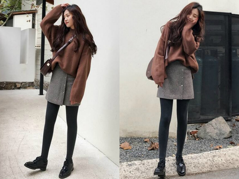 卫衣是百搭的单品之一,妹子上身穿一件宽松型的棕色卫衣,刚好把身上的赘肉全都给隐藏了起来,下身搭配一条A字型半身裙,修饰臀型与遮住大腿,里面再搭配一条黑色打底裤,脚上穿一双黑色小皮鞋,从视觉上起到无限拉长腿型的作用。