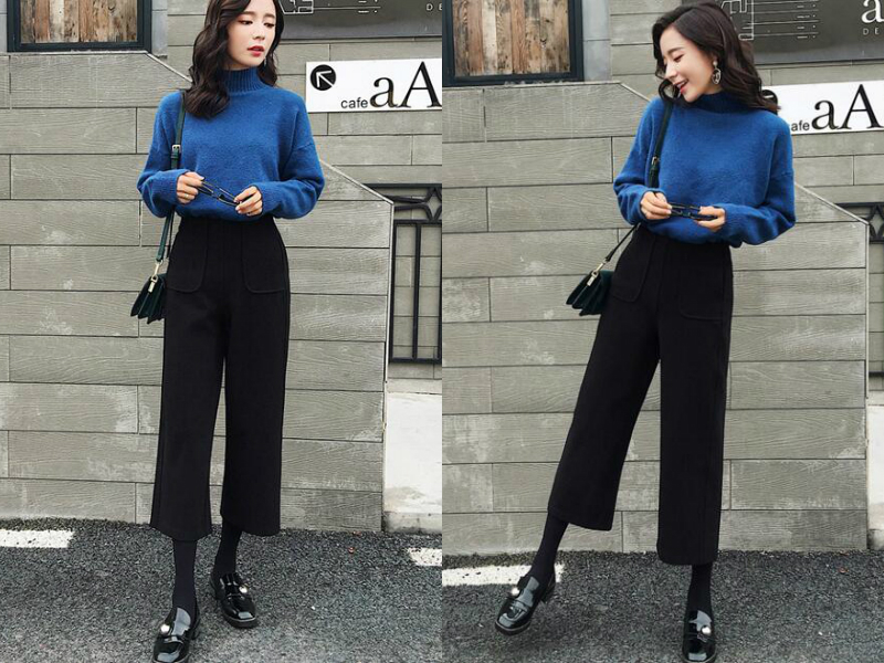 宝蓝色的针织衫看起来亮丽明媚,衬托出妹子优雅的气质,下身搭配一条黑色阔腿裤,把针织衫束进裤子里,瞬间露出小蛮腰,阔腿裤笔直的版型使妹子双腿看起来又细又长,加上还穿着黑色连裤袜和黑色小皮鞋,更使人显高显瘦了。