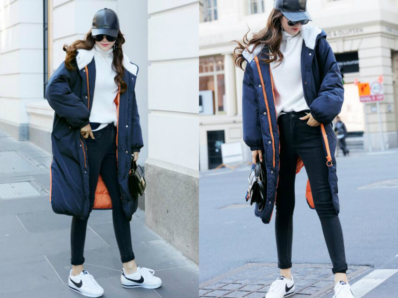 属于运动风的一款服饰look,内里穿一件纯白色的高领毛衣,简洁而大方,下身搭配一条黑色紧身裤,修饰腿型,黑与白的碰撞经典又美观,外面再搭配一件中长款的深蓝色羽绒服,既保暖又修身,加上妹子披散着一头金黄色的长卷发,时髦中透露着一丝灵动feel。