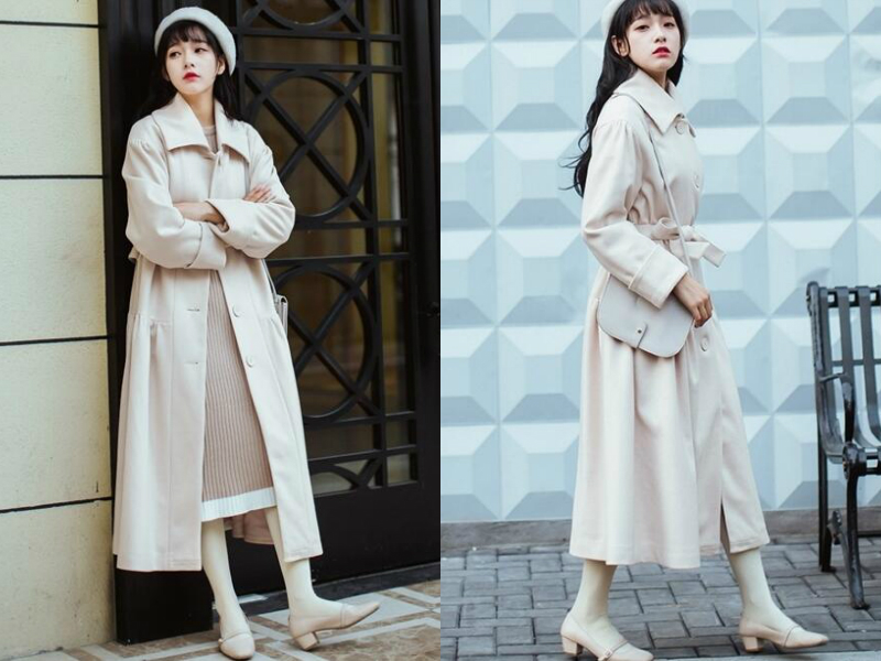 这套服饰搭配看起来比较素,给人一种婉约纯美的感觉。纯色系的长款风衣与肌肤颜色相近,更衬托出妹子皮肤白皙,长至小腿的下摆使妹子整个人看起来又高又瘦,里面随意搭配一条肉粉色的连衣裙,倍显端庄淑女。