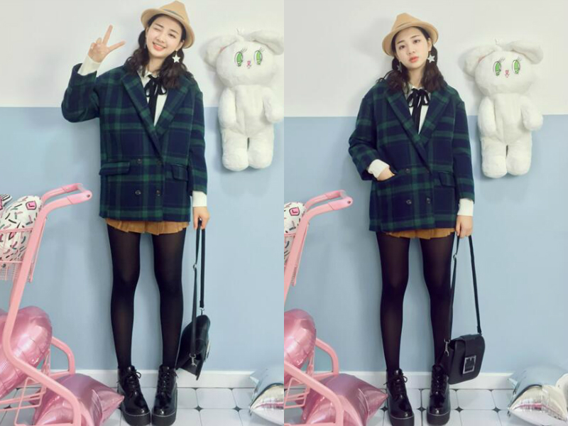 身形较娇小的妹子可以试试这套服饰搭配,内穿一件白色衬衫,蝴蝶系带的领口增添甜美感,下身穿一条棕色百褶裙搭黑色裤袜,脚上再穿一双黑色短筒靴,露出大部分的腿使身高明显增高不少,最后穿上一件短款的格子外套,长度刚好与裙子接近,比例上更把腿型拉长,从而突出妹子纤细的双腿。