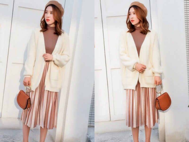 百褶裙穿起来就是有遮肉显瘦的效果,风琴式的皱褶很有视觉上的显瘦效果,上身套一件宽松的针织开衫,V领的设计很好修饰颈部线条,内搭的高领打底衫颜色较深,和裙子的颜色一样,针织开衫外套白色,外浅内深的搭配技巧,更有显瘦的效果,偏胖女生也可以拥有瘦瘦的美。