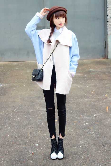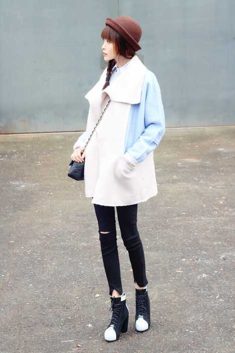 超清新的拼色毛呢外套,错综复杂的视觉效果,给人带来清新的视觉享受,内搭经典的毛衣配白色衬衫,下身搭配黑色的紧身窄脚裤子和英伦范的女鞋,显瘦显高,配上复古英伦范的帽子,衬托淡淡的甜美复古风。