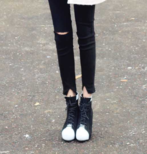 舒服的圆头设计,经典的黑白拼接,与裤子搭配相呼应,微微露出的脚部,呈现出小性感的美感。