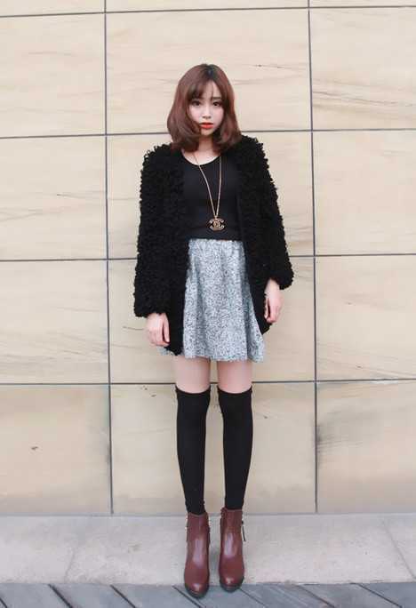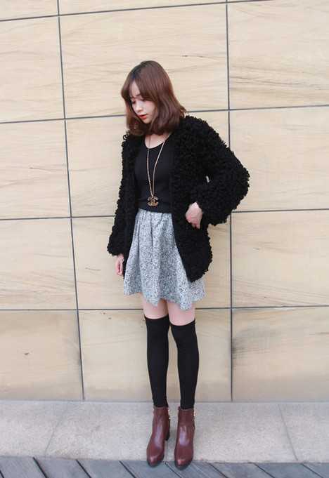 软绵绵的羊羔毛外套,很保暖时尚呢,内搭同色系的黑色T衫和高腰灰色毛呢裙子,凸显出你婀娜多姿的身材,过膝长袜搭配复古酒红色的短靴,完美呈现出英伦范浓浓的复古韵味。