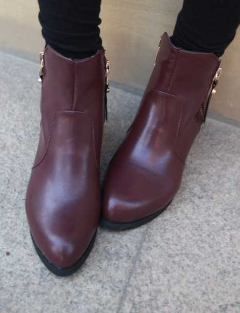 侧面看这款复古女靴一样很美,复古的酒红色流行元素,简约大方的鞋型设计,让你高调出行。