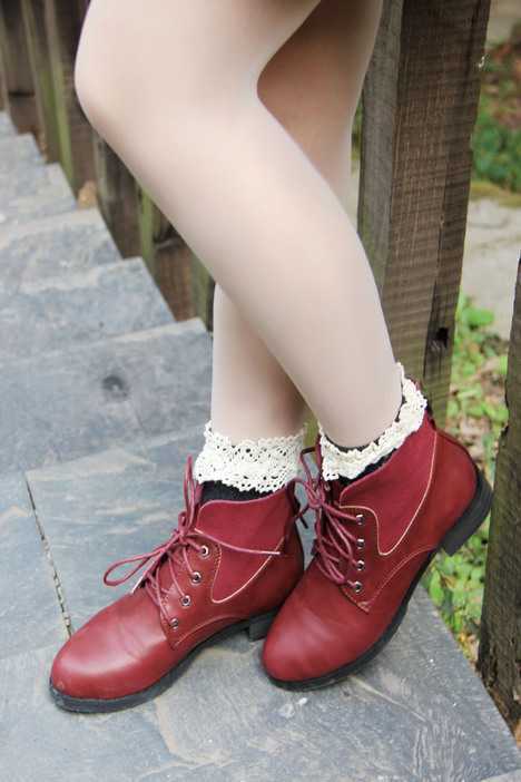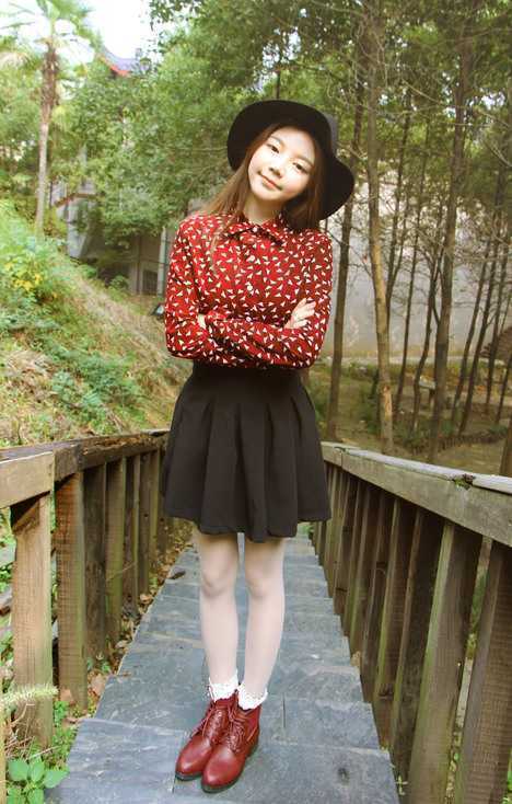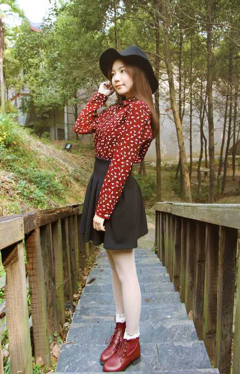 身处于田园风光色彩的公园里,穿上一对酒红色的鞋子,可以配上蕾丝边的厚袜子很有田园清新气息,上身搭配简约酒红色的衬衫和超显瘦的高腰裙,穿出青春小清新学生妹气质。