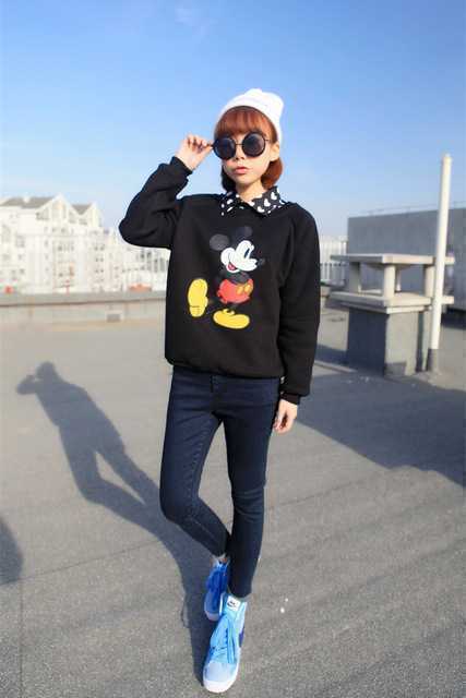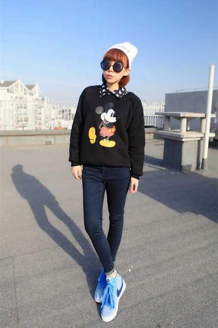 清爽天蓝色运动鞋,穿着很舒服好看,上身搭配可爱的米奇卡通印花卫衣,内搭永不过时的黑色衬衫,下身搭配深蓝色的休闲裤,一身休闲风的装扮看上去很时尚清秀。