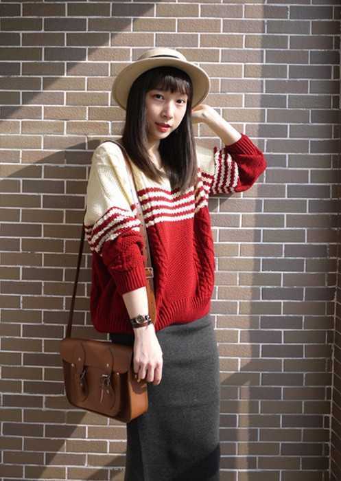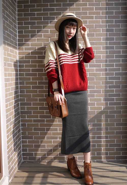 经典的绑带马丁靴款式,穿搭深灰色的包臀长裙,很时尚潮流,穿出玲珑有致体态,上衣搭配复古红的毛衣,透露出一股浓郁的复古时尚气息,穿起街头潮流范儿。