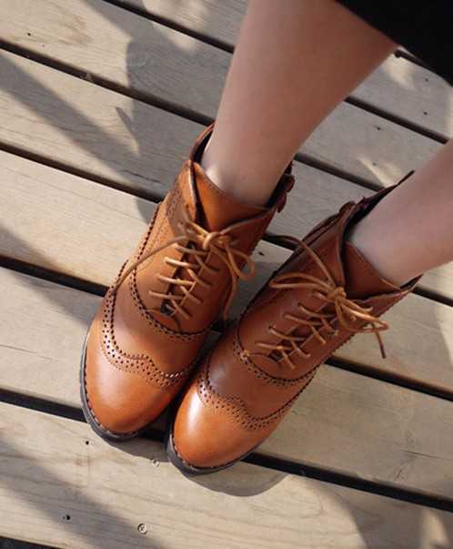 复古的棕黄色绑带马丁靴,镂空的花纹设计,增添了几分优雅气息,高品质的材质,让你穿起来舒适贴脚。