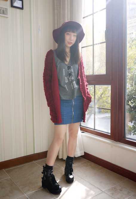 酷感十足的马丁靴,穿起来很帅气随性,搭配超显瘦的短款牛仔包臀裙,很时尚有个性,搭配今年潮流的复古红色开衫外套,轻易让你穿出街头潮流范儿。