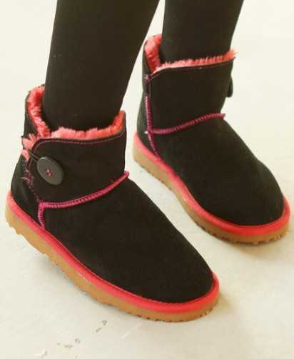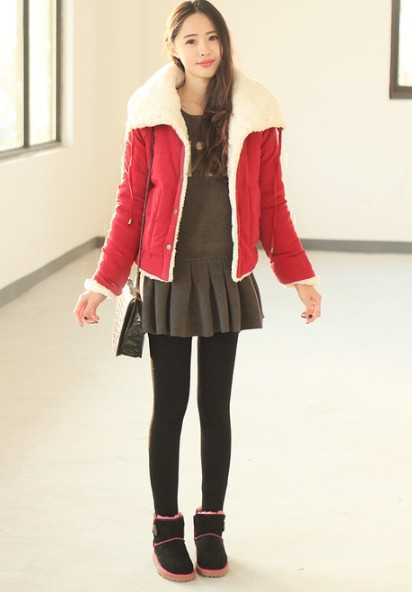 艳红色的羊羔毛棉衣,内搭淑女的百褶连衣裙,尽显优雅女性气质,搭配荧光粉与黑色拼色的雪地靴,为整个装扮增加了活力与亮点韩范十足的雪地靴,轻松时尚翻倍。