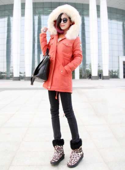 抢眼的橙色棉衣,奢华的貂毛连衣帽,尽显时尚味道,搭配百搭黑色紧身裤,加上韩范十足的豹纹雪地靴,非常时尚大牌,在冬日里如此搭配,回头率百分百。