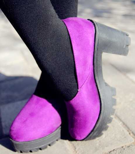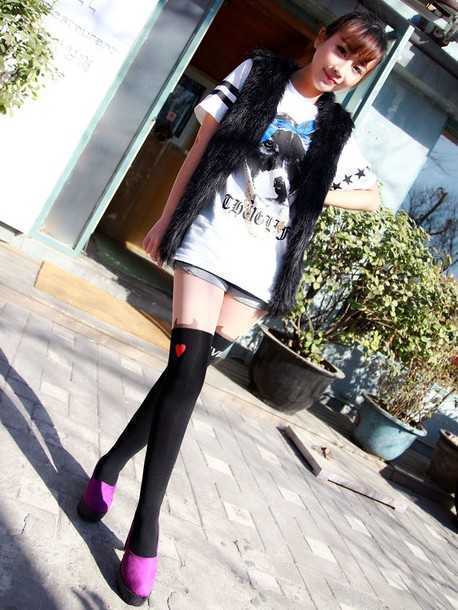 抢眼春季玫红色厚底粗跟鞋,搭配清爽白色T衫,很干净休闲,搭配黑色貂皮马甲,奢华又显时尚感,加上帅气短裤和过膝长袜,酷感中带点休闲风。