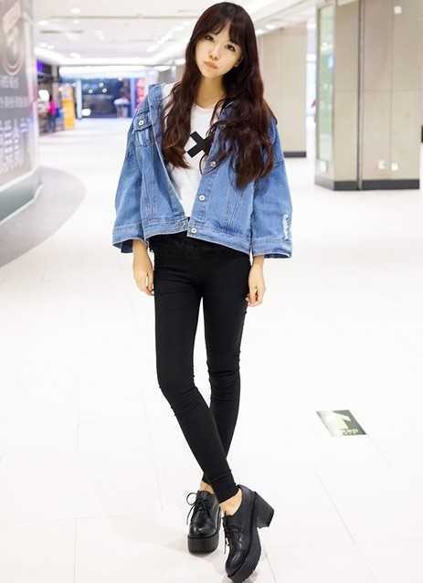 百搭春季黑色厚底粗跟鞋,搭配白色T恤衫,清爽又时尚,搭配帅气牛仔外套,很有型时尚呢,加上黑色紧身小脚裤,尽展出高挑好身材,矮个子MM们也能完美驾驭!