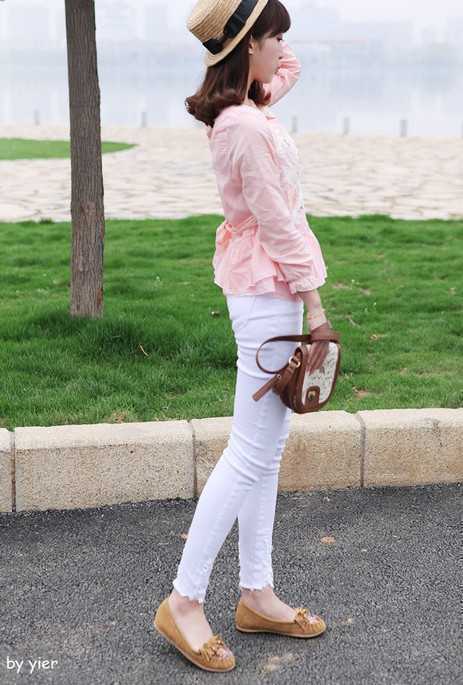 卡其色淑女单鞋,精美流苏点缀,增添时尚感,搭配粉嫩百褶套头衫,很粉嫩减龄,加上净白色小脚裤,更显甜美俏皮感了。