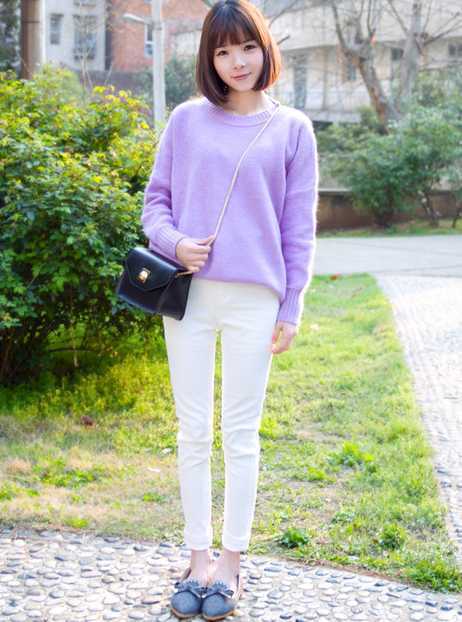日系风深灰色平底鞋,甜美的蝴蝶结点缀更显可爱 感,搭配浪漫紫色毛衣,很显青春活力感,搭配净白色小脚裤,完美凸显高挑身材,一身邻家女孩范儿的装扮让人很爱呢!
