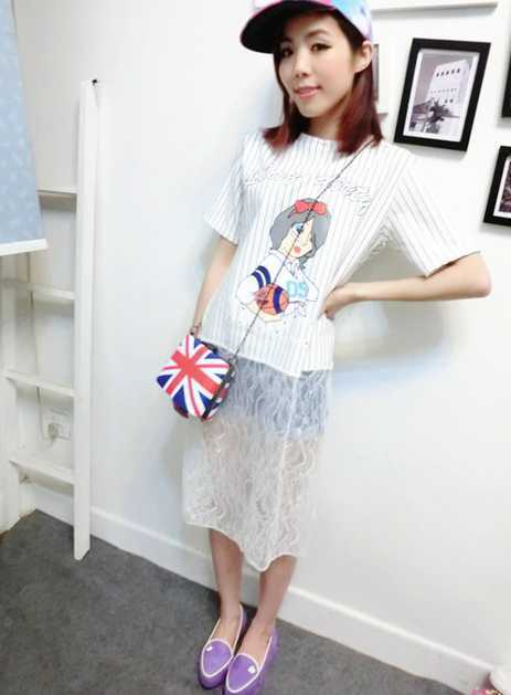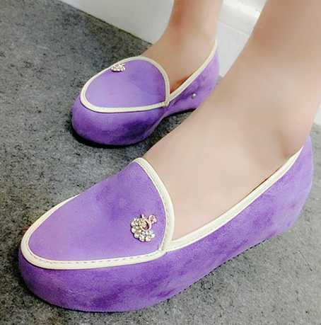 淡淡的紫色总能给人一种浪漫心动的感觉,让人不禁爱上,紫色水钻平底单鞋,高档的磨砂绒舒服贴脚,搭配蕾丝拼接长款t恤衫,酷气中带点小甜美的感觉。