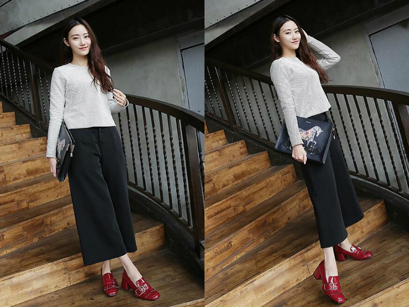 灰色的圆领长袖T恤款式简约宽松,下身则是搭配了黑色阔腿裤,很好打造了职场女士的知性优雅,红色的方扣单鞋非常醒目,缓和了灰色和黑色的沉闷色彩。