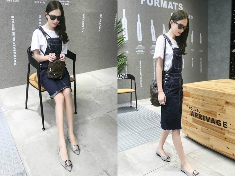 背带牛仔裙弥漫着俏皮迷人的的气息,穿上去会让显得清新,搭配白色的短袖体恤衫,时尚青春,这样穿搭休闲舒适,又不缺魅力,淡灰色的尖头方扣单鞋款式时尚百搭。