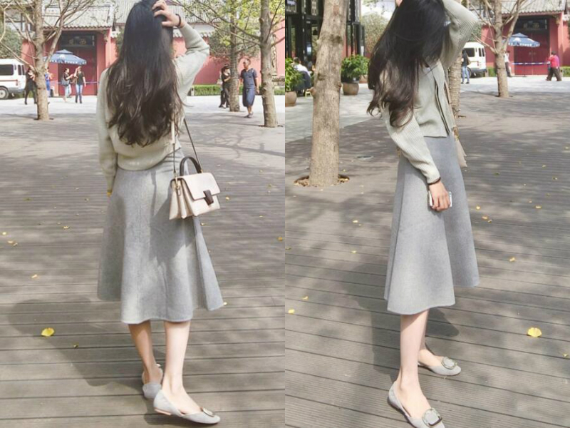针织衫搭配中长款半身裙,看起来大方得体,裙子的材质很有质感,与脚上穿的方扣平底单鞋同为灰色系,看起来很舒服,虽然整体装扮的颜色偏灰,却不会给人沉闷感,在冬日里反而更显优雅。