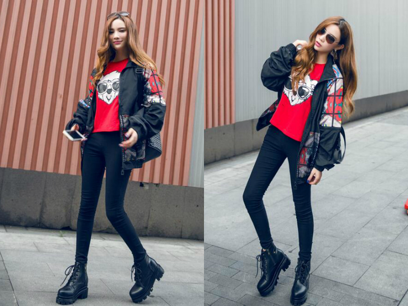 这款英伦风女靴的设计较前卫,外形像军靴让人觉得又酷又帅,加高的厚底设计不但让女生增高还让她气场更强一点,搭配一件嘻哈风格的外套,把女生那种新潮有型的性格展现出来,内搭的红色T恤上大大的卡通印花又增添可爱感,混搭得很成功。