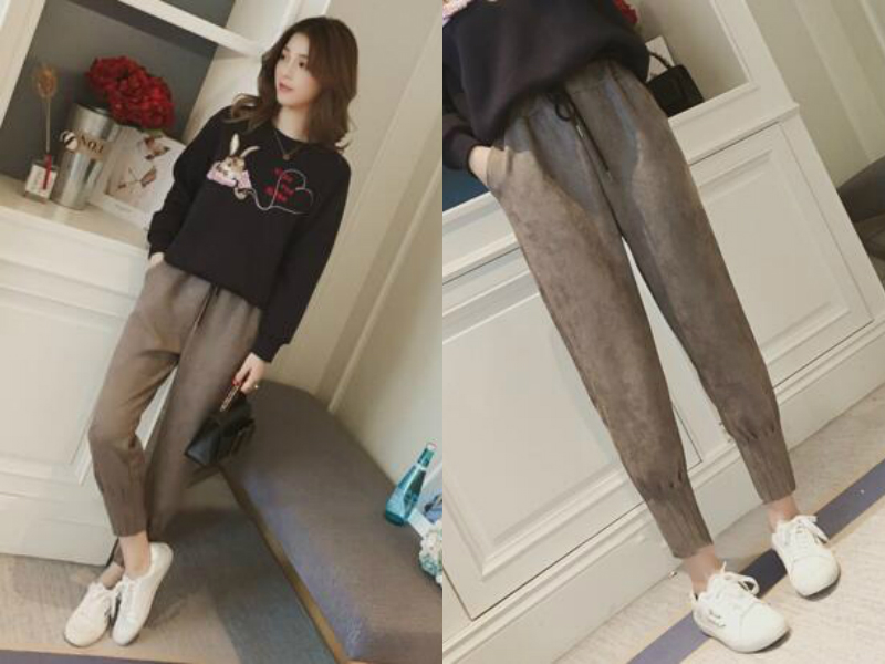 光滑细腻的面料,立体贴身从上往下靠拢的裤型,腰间抽绳绑带,九分裤型微露脚踝,穿上一双帆布鞋,上衣用卫衣搭配,这样就能让你看起来动感十足,青春活力。