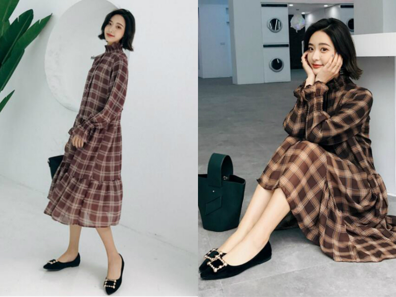 3.时尚平底单鞋+格子连衣裙