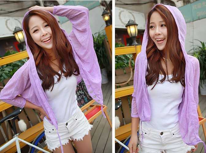 轻盈的防晒小衫,充满迷人气息的荧光紫,一眼就会让人很喜欢,很舒心的感觉。春天夏天都很让人心动的流行色。