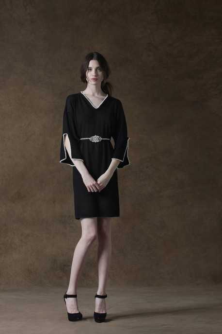 宫廷风十足的一款小黑裙,略微宽松的版型,让你穿着更加舒适休闲,领口是V字的设计,露出迷人的锁骨,袖子的挖空设计十分独特大气,银白色的包边设计将优雅大气的气息彰显得淋漓尽致。