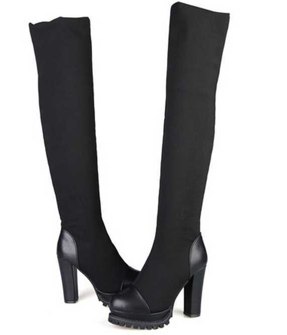 给人浓郁神秘感的黑色高筒靴子,既能很好的修身完美腿型线条,又能在寒冬里温暖与分度兼备,不同材质的拼接,穿上去很美很优雅,上衣随意搭配藏蓝色裙子或者外套就很时尚独特。