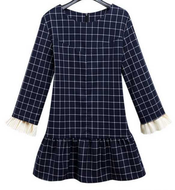 沉寂的藏蓝色格子连衣裙,袖口拼接小甜美的白色蕾丝,尽显清新甜美风,修身的腰身设计,尽显玲珑有致身姿,搭配欧美范十足的高筒靴子,简单的搭配让你很清新很时尚,寒风来临时随意搭配长款大衣就很好看百搭了。