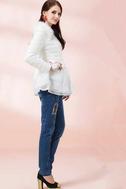 甜美性感的雪纺拼接白色羽绒服,奢华的肩部设计,轻易穿出显眼靓丽冬日装扮,搭配酷气的牛仔裤,时尚感倍增,搭配优雅的“土豪金”高跟鞋,整个装扮闪亮起来,散发出浓郁的迷人女性魅力。